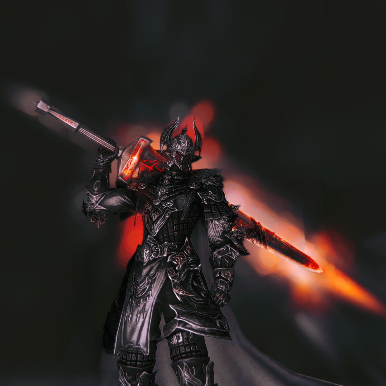 Dedicated body and soul to the example of Tryphaniel the Unshod, Roland is a novitiate yet bears the arms and armor of a master Dark Knight. Other travelers of the forsaken path may recognize the aether of his soul crystal, or the wrathful flame that tempers his blade.A rare sort may even know of his instructor, Giraud de Rochefort - who once wore the horned helm that now rests uneasy on Roland's crown.